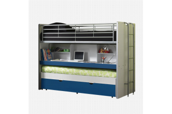 Met deze functionele, compacte hoogslaper heb je direct 3 volwaardige slaapplaatsen in je kamer. De hoogslaper heeft een onderschuifbed met daaronder weer een uitschuifbare lade voor nog een extra slaper of voor bergruimte. Boven de onderschuiflade heeft de hoogslaper heel veel schrijf- en bergruimte in de open vakken. Dit schrijfgedeelte met vakken is volledig uittrekbaar. Bovenop zorgt een metalen uitvalhek aan weerszijden ervoor, dat de hoogste slaper veilig slaapt. Een metalen trap, die zowel links als rechts kan worden gemonteerd, dient ervoor om gemakkelijk je bed in en uit te kunnen stappen. Het bed is inclusief houten lattenbodems, maar zonder matrassen. In de collectie van huisenthuis.nl heb je hierin een prima assortiment en kun je gemakkelijk een matras in de maat 90×200 cm. vinden voor de 2 bedden. In de uitschuifbare lade past een matras in de maat 90x190cm. met een maximale dikte van 12 cm.