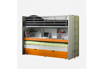 Met deze functionele, compacte hoogslaper heb je direct 3 volwaardige slaapplaatsen in je kamer. De hoogslaper heeft een onderschuifbed met daaronder weer een uitschuifbare lade voor nog een extra slaper of voor bergruimte. Boven de onderschuiflade heeft de hoogslaper heel veel schrijf- en bergruimte in de open vakken. Dit schrijfgedeelte met vakken is volledig uittrekbaar. Bovenop zorgt een metalen uitvalhek aan weerszijden ervoor, dat de hoogste slaper veilig slaapt. Een metalen trap, die zowel links als rechts kan worden gemonteerd, dient ervoor om gemakkelijk je bed in en uit te kunnen stappen. Het bed is inclusief houten lattenbodems, maar zonder matrassen. In de collectie van huisenthuis.nl heb je hierin een prima assortiment en kun je gemakkelijk een matras in de maat 90×200 cm. vinden voor de 2 bedden. In de uitschuifbare lade past een matras in de maat 90x190cm. met een maximale dikte van 12 cm.