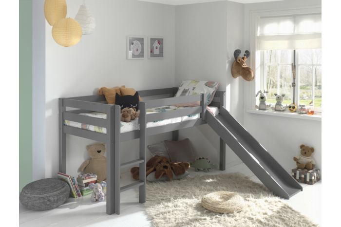 Deze stabiele halfhoogslaper is gemaakt van Scandinavisch grenen is afgewerkt met een sterke lak. Roetsj elke ochtend, of meerdere keren per dag, van de glijbaan af en begin je dag met een lach! Een veilige nachtrust is gegarandeerd door de valbeveiliging rondom het slaapgedeelte. De ladder en glijbaan kunnen zowel links als rechts gemonteerd worden. De lattenbodem wordt meegeleverd, in dit bed past een matras van 90×200 cm. Bekijk ook de rest van deze collectie voor bijpassende items!
