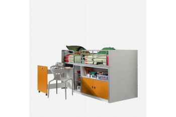 Deze strak gevormde halfhoogslaper met oranje gelakte voorfronten heeft links een handig uitschuifbaar volwaardig bureau, middenin 3 open vakken en rechts 2 oranje gelakte deuren met daarboven nog een breed open vak. De 2 metalen uitvalhekken zorgen voor een prima bescherming. Het bed is inclusief een houten lattenbodem, maar een matras van 90×200 cm. dien je wel los bij te bestellen. In de collectie van huisenthuis.nl heb je hierin een prima assortiment.