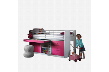Deze functionele halfhoogslaper met fuchsiakleur gelakte voorfronten heeft links een handig uitschuifbaar bureaublad op metalen ladegeleiders, daaronder 2 fuchsiakleur gelakte deuren en 2 open vakken en rechts 3 fuchsiakleur gelakte brede laden. Het metalen uitvalhek over de volle lengte zorgt voor een prima bescherming. Aan de rechterkant zorgt een metalen trap ervoor, dat je gemakkelijk kunt gaan slapen. Het bed is inclusief een houten lattenbodem, maar een matras van 90×200 cm. dien je wel los bij te bestellen. In de collectie van huisenthuis.nl heb je hierin een prima assortiment.