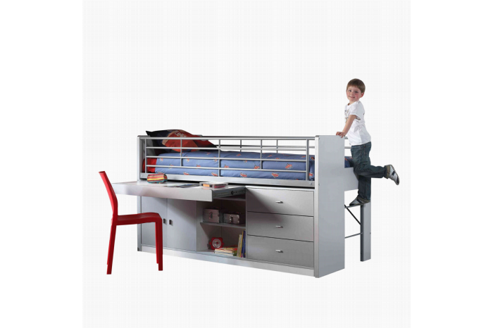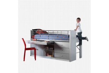 Deze functionele halfhoogslaper met zilverkleurig gelakte voorfronten heeft links een handig uitschuifbaar bureaublad op metalen ladegeleiders, daaronder 2 zilverkleurig gelakte deuren en 2 open vakken en rechts 3 zilverkleurig gelakte brede laden. Het metalen uitvalhek over de volle lengte zorgt voor een prima bescherming. Aan de rechterkant zorgt een metalen trap ervoor, dat je gemakkelijk kunt gaan slapen. Het bed is inclusief een houten lattenbodem, maar een matras van 90×200 cm. dien je wel los bij te bestellen. In de collectie van huisenthuis.nl heb je hierin een prima assortiment.
