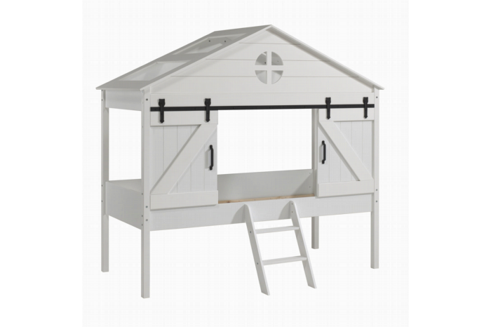 Een perfecte hoogslaper met schuifdeuren waarmee je het huisje leuk kunt afsluiten. Het bed is vervaardigd uit massief houten staanders met MDF panelen. Alles is wit gelakt.