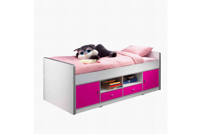 Dit strak gevormde kajuitbed met fuchsiakleur gelakte voorfronten heeft links en rechts een deur en middenin 2 laden op telescoopgeleiders met daarboven nog 2 open vakken. Dit bed is exclusief lattenbodem. In het bed past elke matras van 90 x 200cm uit de collectie van huisenthuis.nl. Deze dien je wel apart bij te bestellen.