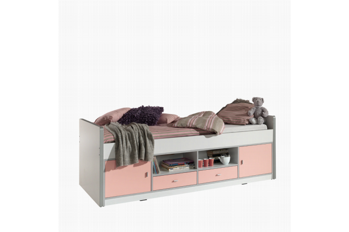 Dit strak gevormde kajuitbed met roze gelakte voorfronten heeft links en rechts een deur en middenin 2 laden op telescoopgeleiders met daarboven nog 2 open vakken. Dit bed is exclusief lattenbodem. In het bed past elke matras van 90 x 200cm uit de collectie van huisenthuis.nl. Deze dien je wel apart bij te bestellen.