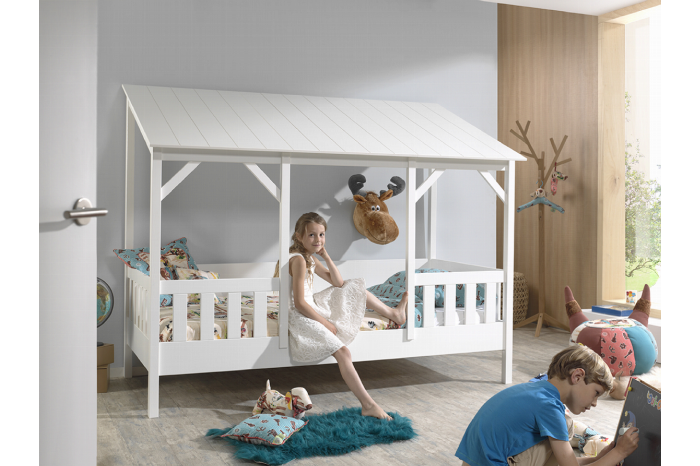 Met dit stevige huisbed heeft ieder kind een heerlijke plek om te slapen en te spelen. Het bed is voor een groot gedeelte omringd door een speels hekwerk wat tevens als uitvalbeveiliging dient. Door de verticaal gefreesde lijnen op het dak in combinatie met het wit gelakte frame is dit bed een echte eyecatcher in je kinderkamer. Dit bed wordt geleverd exclusief lattenbodem. Het bed is vervaardigd uit een combinatie van massief grenen en MDF. Verkrijgbaar in verschillende uitvoeringen.