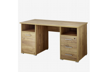 Het bureau heeft volop bergruimte. Acher de deur zijn 2 bergvakken met een verstelbare legplank. Rechts zijn 3 ruime laden die afsluitbaar zijn. Boven elke blok is boven en rechts nog een open vak.