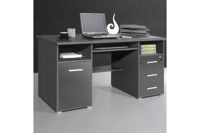 De bureautafel heeft rechts een blok met een open ruimte en daaronder 3 laden. De bovenste lade is afsluitbaar. Met metalen handgrepen. Midden een uitschuifbaar plateau voor uw toetsenbord met nog een verdiepte legplank. Links een blok met daarboven ook een open ruimte met daaronder een deur waarachter de computer tower opgeborgen kan worden. Het gehele bureau is afgewerkt in een anthracietkleurige melamine die krasvast is en eenvoudig te reinigen.Weet jij dat wij ook een ruime collectie bijpassende bureaustoelen hebben in top kwaliteit ?