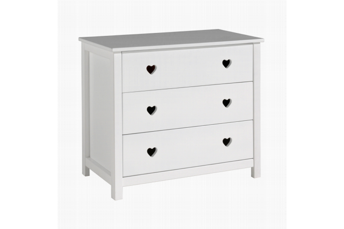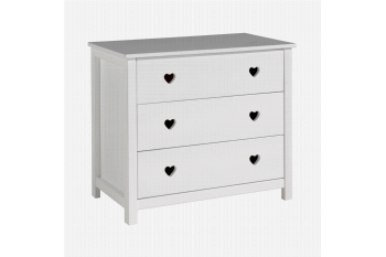 De kommode heeft 3 diepe lades waarbij de decoratieve hartjes ook als trekker functioneren om de lade te kunnen openen. De kommode is gemaakt van hoogwaardig wit gelakt MDF.