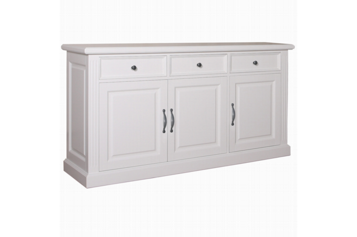 Landelijk dressoir met een sierlijke uitstraling, het dressoir is geplaatst op een plint en heeft 3 deuren en boven elke deur is een lade geplaatst met softclose.U heeft de mogelijkheid om het dressoir met een antiek finish af te laten werken, de randen worden licht opgeschuurd en bewerkt zodat er een antiek uitstraling ontstaat.Stel u eigen dressoir samen door u eigen kleur te kiezen en het dressoir te voorzien van het beslag naar u keuze.