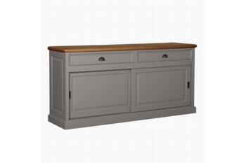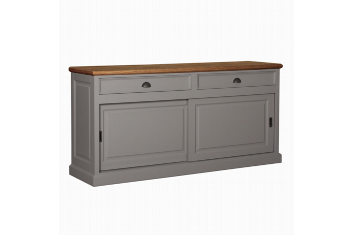 Perfect afgewerkt dressoir, de schuifdeuren schuiven over een aluminium rails en de laden zijn voorzien van softclose.Door het eiken blad krijgt het dressoir een landelijke uitstraling.Er is keuze uit diverse kleuren en verschillende soorten beslag. De bovenbladen zijn ook verkrijgbaar in een doorlopend blad.