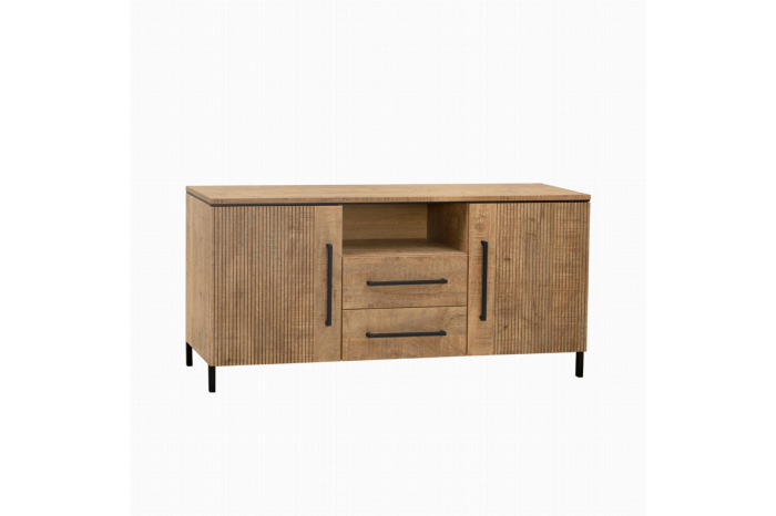 Het dressoir heeft aan de linker- en rechterkant een vak dat wordt afgesloten met een openslaande deur. Elk vak heeft een plank om het interieur te verdelen. In het midden van de kast bevinden zich 2 lades met daarboven een open vak. De laden en deuren zijn voorzien van softclose, waardoor ze zacht en soepel sluiten. Ze hebben lange zwarte metalen handgrepen.