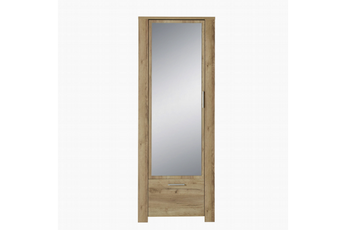 In deze stijlvolle 1-deurs garderobekast in repro eiken melamine met een gehard glazen spiegelvoorfront, liggen achter de deur 3 verstelbare legplanken.In de ruime lade onder kun je alle kleinere spulletjes een mooie plaats geven.Een uittrekbare kledingstang zorgt ervoor, dat uw kleding netjes weg hangt.