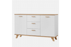• Dressoir Sundsvall 144 CM Deze dressoir heeft links en rechts een deur, in het midden zijn 3 diepe laden. Het dressoir is maar 144 cm breed dus kan in vele interieurs zijn plaatsje vinden. De laden zijn zelfsluitend.