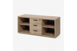 • Bijzetkast Edison Deze lage bijzetkast uit de kantoorcollectie Edison heeft een warme uitstraling door de afwerking in goudeiken. Door het strakke zwarte handvat heeft het meubel toch een moderne look.
