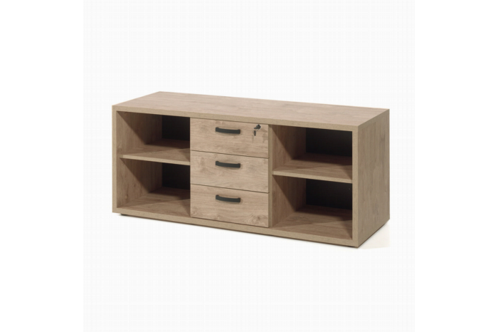 Deze lage bijzetkast uit de kantoorcollectie Edison heeft een warme uitstraling door de afwerking in goudeiken. Door het strakke zwarte handvat heeft het meubel toch een moderne look. De platen zijn afgewerkt met een sterk krasvast melamine toplaag. Het ladeblok in het midden van de kast heeft 3 lades met een slot zodat u uw spullen veilig kunt opbergen. Aan beide kanten van dit blok bevinden zich nog twee planken voor nog meer spullen! Dit ladeblok past perfect bij één van de bureaus of de andere kasten uit de serie Edison.