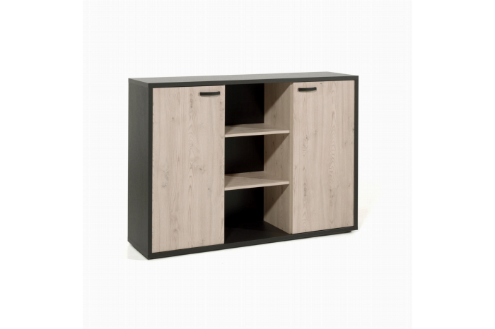 Dit dressoir uit de kantoorcollectie Spinoza heeft een trendy uitstraling door de afwerking in lichtkastanje hout met zwart accenten. De strakke zwarte handvatten maken het moderne meubel helemaal af. De platen zijn afgewerkt met een sterk krasvast melamine toplaag. Achter de twee openslaande deuren bevinden zich aan beide kanten nog twee planken om uw spullen op te bergen. U heeft hiermee daarom genoeg opbergruimte! In combinatie met de andere kasten van de kantoorcollectie Spinoza kunt u een mooie wandcombinatie maken.
