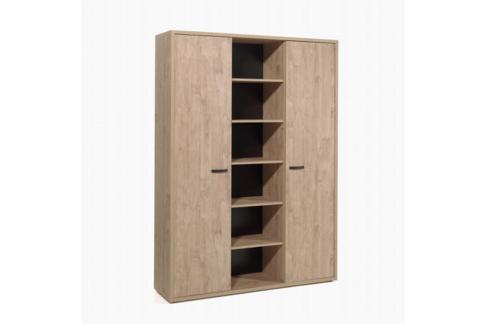Deze grote hoge halfopen kast uit de kantoorcollectie Edison heeft een warme uitstraling door de afwerking in goudeiken. Door de strakke zwarte handvatten heeft het meubel toch een moderne look. De platen zijn afgewerkt met een sterk krasvast melamine toplaag. Achter de twee openslaande deuren bevinden zich aan beide kanten vijf planken om uw spullen op te bergen. In deze kast is dan dus ook meer dan genoeg opbergruimte! In combinatie met de andere kasten van de kantoorcollectie Edison kunt u een mooie wandcombinatie maken.