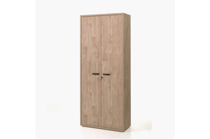 Deze hoge dichte kast uit de kantoorcollectie Edison heeft een warme uitstraling door de afwerking in goudeiken. Door de strakke zwarte handvatten heeft het meubel toch een moderne look. De platen zijn afgewerkt met een sterk krasvast melamine toplaag. Achter de twee openslaande deuren bevinden zich vijf planken om uw spullen op te bergen. Door middel van het slot kunt u uw spullen ook veilig opbergen. In combinatie met de andere kasten van de kantoorcollectie Edison kunt u een mooie wandcombinatie maken.