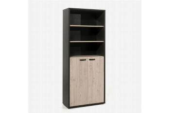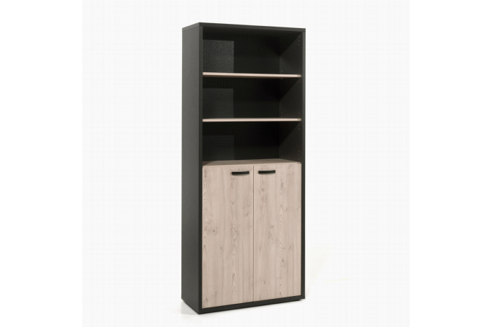 Deze hoge halfopen kast uit de kantoorcollectie Spinoza heeft een trendy uitstraling door de afwerking in lichtkastanje hout met zwart accenten. De strakke zwarte handvatten maken het moderne meubel helemaal af. De platen zijn afgewerkt met een sterk krasvast melamine toplaag. Achter de twee openslaande deuren bevinden zich nog twee extra planken om uw spullen op te bergen. In combinatie met de andere kasten van de kantoorcollectie Spinoza kunt u een mooie wandcombinatie maken.