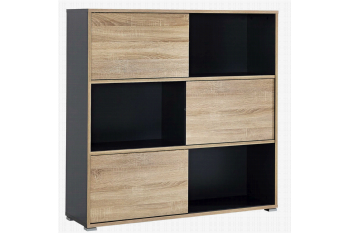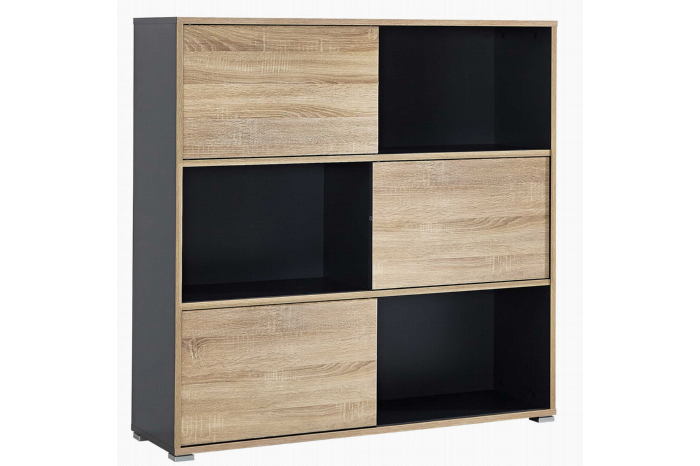 Deze kast heeft 3 brede opbergvakken waarin een schuifdeur zit die van links naar rechts en v.v. schuift. Het voordeel van deze indeling is dat je er toch een speels karakter aan kunt geven door je mappen in b.v. kleurtjes er in te zetten of om hier en daar een decoratie artikel te gebruiken. Deze kast is ook perfect te combineren met het hoge model kast.