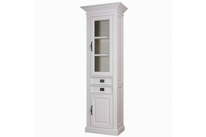 Landelijke vitrinekast voorzien van een sierlijke koof. De vitrinekast heeft boven een glasdeur en onder een handig opbergvak met daarboven een lade.U heeft de mogelijkheid om de kast met een antiek finish af te laten werken, de randen worden licht opgeschuurd en bewerkt zodat er een antiek uitstraling ontstaat.Stel u eigen kast samen door u eigen kleur te kiezen, zo is het mogelijk om de binnenkant en de legplanken een andere kleur te geven dan de buitenzijde. U heeft ook de keuze uit diverse soorten beslag.