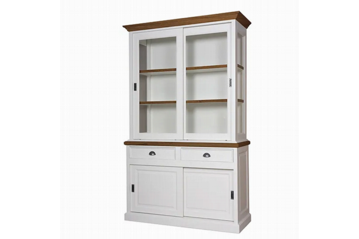 Landelijke vitrinekast, de kast is voorzien van schuifdeuren op een aluminium rails voor optimaal gebruik, de laden zijn voorzien van softclose.De vitrinekasten uit de serie Barneveld zijn uitgevoerd met glas aan de zijkanten. Leverbaar met of zonder eiken accenten.Er is keuze uit diverse kleuren, een combinatie van twee verschillende kleuren voor de binnen- en de buitenzijde is ook mogelijk. Daarnaast kan er gekozen worden uit diverse soorten beslag.