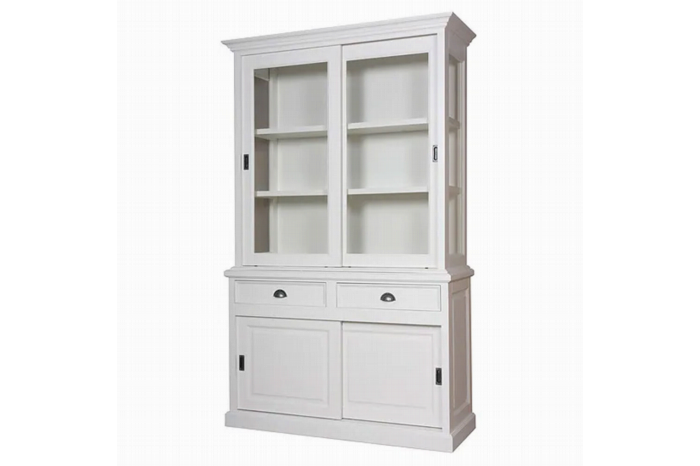 Landelijke vitrinekast, de kast is voorzien van schuifdeuren op een aluminium rails voor optimaal gebruik, de laden zijn voorzien van softclose.De vitrinekasten uit de serie Barneveld zijn uitgevoerd met glas aan de zijkanten.Er is keuze uit diverse kleuren, een combinatie van twee verschillende kleuren voor de binnen- en de buitenzijde is ook mogelijk. Daarnaast kan er gekozen worden uit diverse soorten beslag.