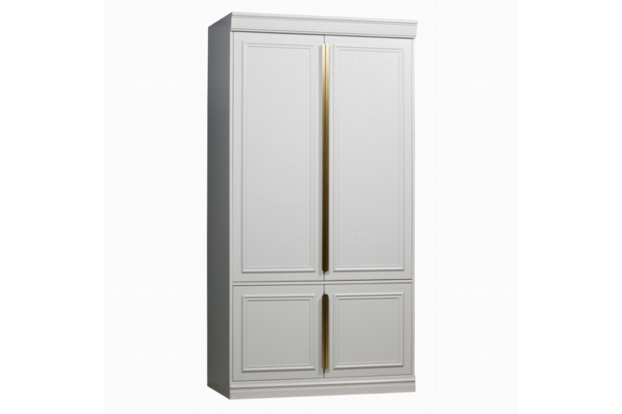 De kledingkast heeft bovenaan 2 deuren met daarachter een groot vak. In dit vak bevindt zich een plank met daaronder een roede. Onderaan zijn er ook 2 deuren met een lager vak. Dit vak is verdeeld met een plank. Als extra optie is er een set legplanken verkrijgbaar, waarmee je de kast eenvoudig kunt veranderen in een wandkast met extra opbergruimte.