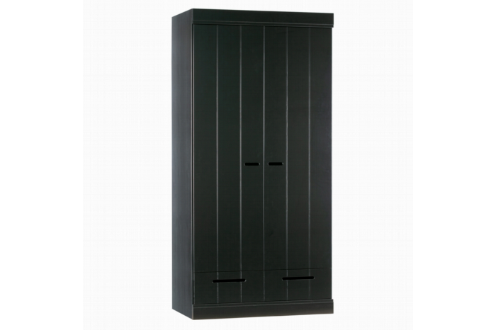 De Connect 2-deurs kast heeft een breedte van 94 cm, een diepte van 53 cm en een hoogte van 195 cm. De kast is gemaakt van zwart gelakt grenenhout met zichtbare nerven en knoesten. Deze natuurlijke kenmerken geven de kast karakter. De Connect kledingkast moet nog worden gemonteerd. Door twee of meer van deze kasten naast elkaar te plaatsen en te koppelen, creëer je een mooie kastenwand met veel opbergruimte.