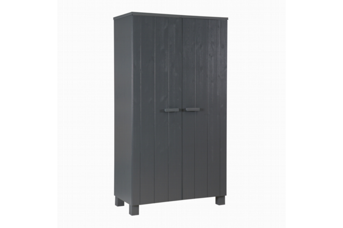 De kledingkast Dennis is een hang/leg kast van Nederlandse afkomst. Het is een product van het merk WOOOD, dat bekend staat om hun hoogwaardige houten meubelen. Dennis is gemaakt van geborsteld grenen met een V-groef afwerking en is gelakt in een donker staalgrijze kleur. Deze 2-deurskast heeft een stoer uiterlijk dat perfect past in een kinder- of tienerkamer, maar ook goed past in een volwassen interieur. Een handige tip is om 2 dezelfde kasten naast elkaar te plaatsen voor maximale opbergruimte.