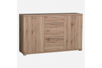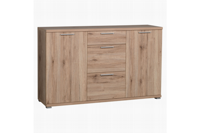 Een solide, gerieflijke dressoir in een soms wilde, robuuste eiken melamine structuur. De soms voelbare oppervlakte structuur geeft het meubel een natuurlijke look. Met links en rechts 1 deur, waarachter telkens 1 legplank. Middenin 1 kleine en 2 grote laden voor het opbergen van al uw kleinere spulletjes. Met volle metalen grepen. Prima te combineren met de meubelen Bastia.