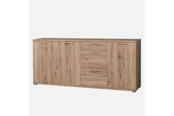 Een solide, gerieflijke dressoir in een soms wilde, robuuste eiken melamine structuur. De soms voelbare oppervlakte structuur geeft het meubel een natuurlijke look. Met links 2 deuren, waarachter telkens 1 legplank. Middenin 1 kleine en 2 grote laden voor het opbergen van al uw kleinere spulletjes. Rechts nog een deur, waarachter een legplank. Met volle metalen grepen. Prima te combineren met de meubelen Bastia.