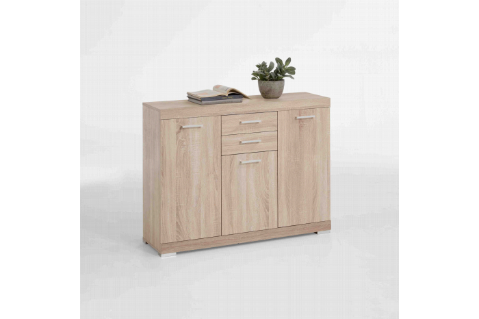 Dit handige dressoir kun je dankzij zijn handige afmetingen gemakkelijk kwijt in je woonkamer, kantoor of keuken. Achter elke deur bevindt zich 1 verstelbare legplank, in combinatie met de 2 lades heb je voldoende opbergruimte. Bovenop de kast kun je nog enkele leuke accessoires kwijt. Deze kast is vervaardigd uit een stevige spaanplaat en afgewerkt met een sterke melamine. Eenvoudig te monteren door middel van de bijgeleverde montagehandleiding. Bekijk ook de bijpassende artikelen uit deze serie!