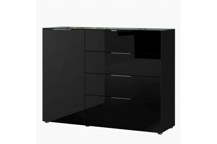 Dit compacte dressoir heeft een assymetrische vormgeving omdat de deur smaller is door de laden, dat maakt zijn eigen karakter. Achter de deur links liggen 3 legplanken en in de 4 soepel lopende laden is veel bergruimte. Het dressoir is uitgevoerd met een softclose-systeem.