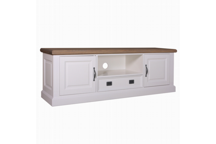 Royaal en stijlvol TV-dressoir in het midden een open vak en een lade met softclose. Aan de zijkanten 2 deuren met daarachter extra opbergruimte.U heeft de mogelijkheid om het TV-dressoir met een antiek finish af te laten werken, de randen worden licht opgeschuurd en bewerkt zodat er een antiek uitstraling ontstaat.Stel u eigen TV-dressoir samen door u eigen kleur te kiezen, zo heeft u o.a. de keuze uit diverse soorten beslag.