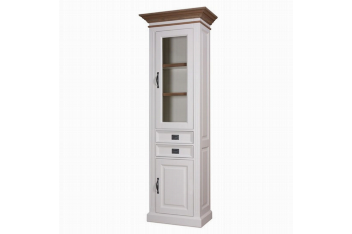 Door de eiken accenten krijgt deze vitrinekast een stoere uitstraling. Daarnaast is de kast ook praktisch zo is behalve de vitrinedeur ook een gesloten deur en lade voor extra opbergruimte.U heeft de mogelijkheid om de kast met een antiek finish af te laten werken, de randen worden licht opgeschuurd en bewerkt zodat er een antiek uitstraling ontstaat.Stel u eigen kast samen door u eigen kleur te kiezen, zo is het mogelijk om de binnenkant en de legplanken een andere kleur te geven dan de buitenzijde. U heeft ook de keuze uit diverse soorten beslag.