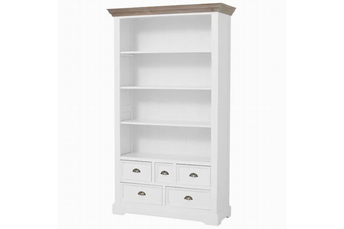 Het romantische en landelijke meubelprogramma Fleur bestaat uit diverse trendy, witte meubelen met vergrijsde houten bladen.De boekenkast biedt naast voldoende ruimte voor uw boeken ook nog handige opbergladen.Afmeting: 111x40x191 (h)cm Kleur: C027 White RAL 9010 - pine old greyBekijk ook de andere meubelen van het romantische programma Fleur.Levertijd: 2 - 4 weken