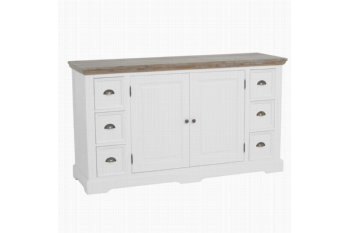 Het romantische en landelijke meubelprogramma Fleur bestaat uit diverse trendy, witte meubelen met vergrijsde houten bladen.Het dressoir is voorzien van 2 grote opbergvakken met openslaande deuren en 6 handige opbergladen.Afmeting: 160x50x90(h)cm Kleur: C027 White RAL 9010 - pine old greyBekijk ook de andere meubelen van het romantische programma Fleur.Levertijd: 2 - 4 weken