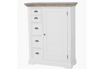 Het romantische en landelijke meubelprogramma Fleur bestaat uit diverse trendy, witte meubelen met vergrijsde houten bladen.De spekkast is voorzien van 1 openslaande deur en 5 opbergladen.Afmeting: 100x40x128 (h)cm Kleur: C027 White RAL 9010 - pine old greyBekijk ook de andere meubelen van het romantische programma Fleur.Levertijd: 2 - 4 weken