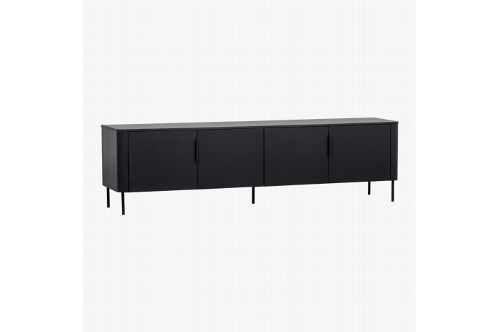 TV-meubel Gunnar van woonmerk WOOOD is een strakke, stijlvolle tv-kast. De kast heeft afgeronde hoeken en is gemaakt van grenenhout met een matzwarte finish. Het hout heeft een zichtbare nerftekening en dit geeft elke Gunnar kast een eigen, unieke look. TV-meubel Gunnar is een moderne en royale kast, perfect voor een eigentijdse woonstijl die wel een elegante touch kan gebruiken. TIP: deze kast is zowel staand als hangend te gebruiken.Indeling:De Gunnar tv-kast heeft 2 dubbeldeurs vakken voor handige opbergruimte. Elk vak heeft er een plank in ter vakverdeling. De kast is voorzien van zwart metalen handgrepen met een strakke vormgeving.Levering & montage:TV-meubel Gunnar wordt in twee pakketten geleverd en moet nog gemonteerd worden. Dit is eenvoudig zelf te doen aan de hand van de bijgeleverde montagehandleiding. Je bepaalt zelf of je de kast met poten monteert, of dat de kast aan een wand gemonteerd wordt. Plaats, bij gebruik van de poten, viltglijders aan de onderzijde van de poten voor het beschermen van harde vloeren.