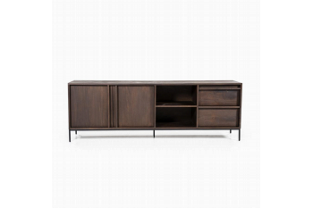 TV-meubel Jimmy voegt een stijlvol accent toe aan de woonkamer. Met twee deuren voorzien van planken, een open vak en ruime lades, biedt het voldoende opbergruimte voor al je spullen. De donkerbruine afwerking in combinatie met het metalen onderstel geeft het meubel een robuuste, industriële uitstraling. Gemaakt van duurzaam mangohout, past deze kast perfect in een interieur met een industriële stijl. De Jimmy-collectie van Eleonora bevat ook een dressoir en verschillende kasten, waardoor je een samenhangend geheel kunt creëren in je interieur.