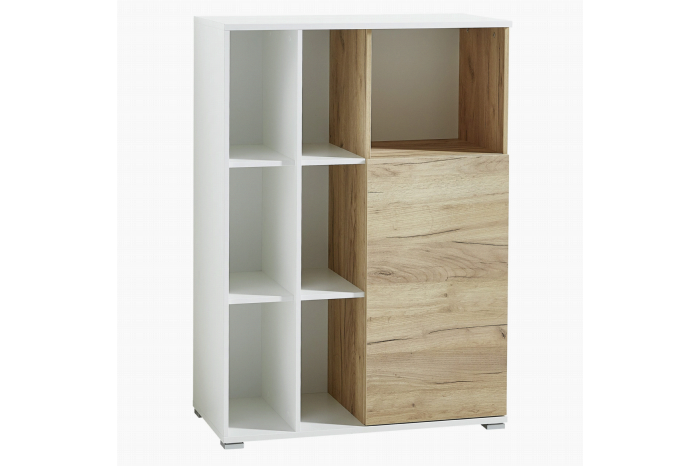 De kantoorkast Kreta-L is een a-symetrisch model met een speelse indeling. Op de foto is rechts een deur waarachter 2 bergvakken en daarboven een open vak. De deur is met een zgn push-to-open systeem te openen. (Druk systeem) Aan de linkerzijde zijn 6 open vakken. Deze kast is ook in spiegelbeeld op te bouwen. Deze kast kan eventueel naast de Kantoorkast Kreta-H gezet worden.