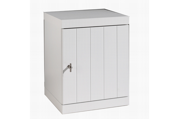 Dit nachtkastje heeft een deur met een handgreep in de vorm van een kraan. Het is vervaardigd uit hoogwaardig MDF en heeft verticale infrezingen in de deur.