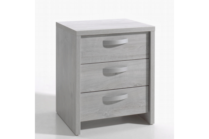 Dit nachtkastje heeft 3 laden met aluminium-kleurige grepen.