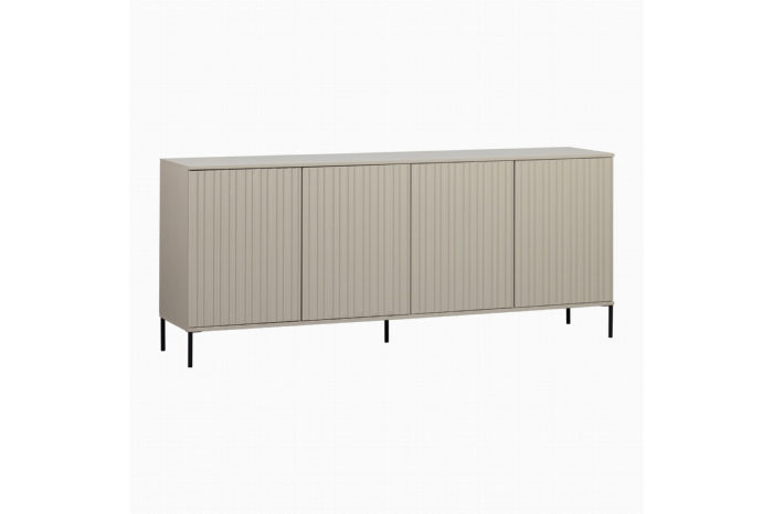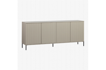 Dressoir New Gravure van interieurlabel WOOOD heeft een modern design met een stijlvol accent op de deuren. De wandkast is gemaakt van grenenhout afgewerkt in kleur Dust. De nerven en knoesten zijn nog steeds zichtbaar en deze natuurlijke kenmerken geven karakter aan het meubel. Het lineaire patroon geeft het strakke dressoir een elegante uitstraling. Het zwart metalen onderstel maakt het geheel luchtig en de greige kleur zorgt voor de elegante finishing touch bij dressoir New Gravure.Indeling:Dressoir New Gravure heeft 4 deuren en achter iedere deur zit een legplank die je op verschillende hoogten kunt plaatsen. De greeploze deuren zijn voorzien van een push-to-open systeem. Het interieur van de kast is van beige spaanplaat.Levering & montage:Het New Gravure dressoir wordt in drie pakketten geleverd en moet nog gemonteerd worden. Volg de duidelijke montage-instructie voor het beste resultaat. Plaats viltglijders onder de poten voor het beschermen van harde vloeren. Zorg dat de omvalbeveiliging goed is gemonteerd om ongelukken te voorkomen.