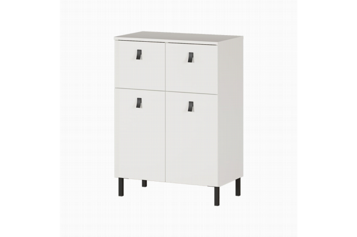 Deze badkamerkast heeft metalen handgrepen en pootjes. Door zijn fraaie design haal je hiermee een echte eyecatcher in huis! Deze kast heeft twee hoge laden en twee deuren met daarachter een verstelbare legplank, allen voorzien van soft close voor optimale demping bij het sluiten. De kast is afgewerkt met een sterke melamine waardoor deze goed is schoon te maken. Leuk te combineren met de rest van deze serie!
