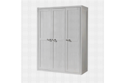 Driedeurskast NoaDeze 3-deurs-linnenkast heeft achter de 2 linkse deuren met touwgrepen over de volle breedte boven een legpank, waaronder een kledingroede en daaronder beneden nog een legplank.