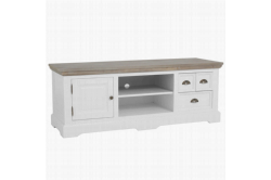 Fleur TV-dressoir 145cmHet romantische en landelijke meubelprogramma Fleur bestaat uit diverse trendy, witte meubelen met vergrijsde houten bladen.