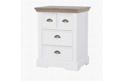 Fleur Ladenkast 56cmHet romantische en landelijke meubelprogramma Fleur bestaat uit diverse trendy, witte meubelen met vergrijsde houten bladen.De ladenkast is voorzien van 2 grote en 2 kleine opbergladen.